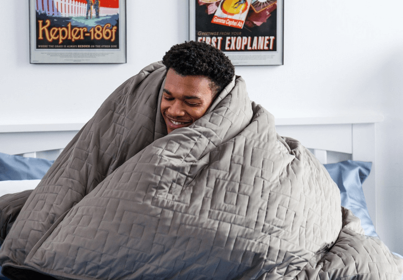 Research suggests sleeping with a weighted blanket can improve sleep quality by providing a reassuring, cocooning feeling.